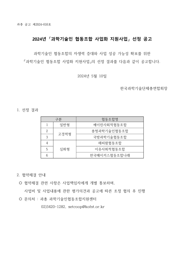 2024년 「과학기술인 협동조합 사업화 지원사업」 선정 공고